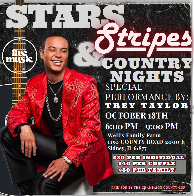 Join the Champaign County Republicans for an old-fashioned barn dance and bonfire. We have country music singer Trey Taylor coming to provide amazing entertainment. We will have hay rack rides and a bonfire where we can make s'mores and roast marshmallows. Bring your family and join us in fellowship and celebration of America!